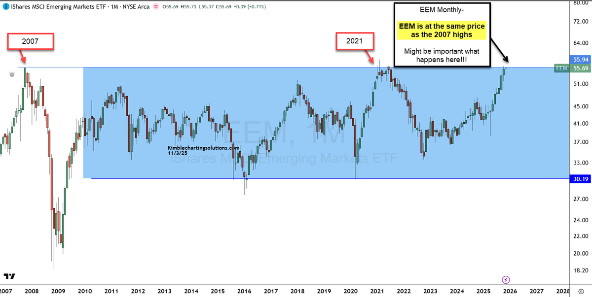 - Chris notes that $EEM is testing final resistance around $56, aligning with the peaks from 2007 and 2021. Given the recent surge, this is a logical level for a pause or pullback. However, if $EEM breaks out and legs higher, it will set the stage for a more aggressive rotation in 2026.