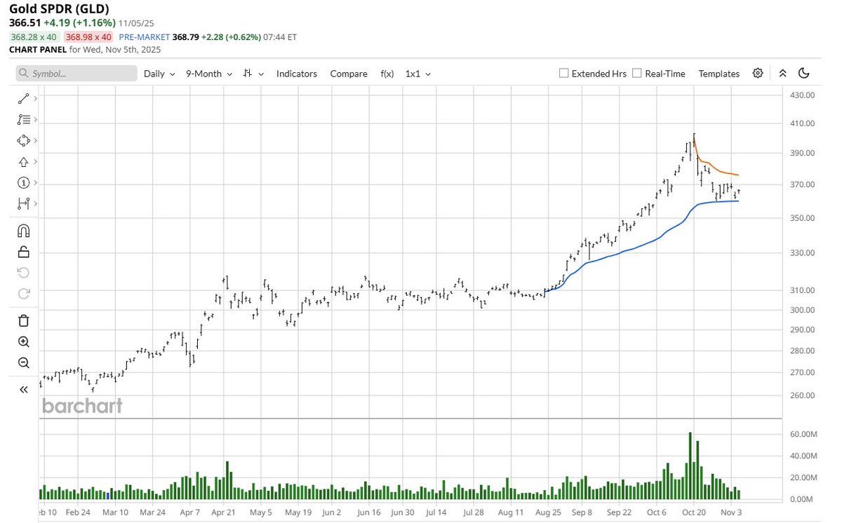 - With $GLD currently at $366, Mark notes that price is pinched between the AVWAP from the peak ($375) and the AVWAP from late August ($360), where it later broke out and ran nearly +30%.
