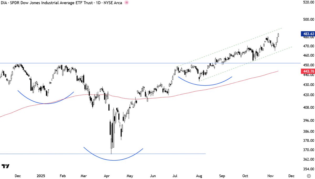- $DIA is nearing the upper bounds of a rising channel after this 4-day run, suggesting another pullback is likely before we wear our Dow 50k hats. But as Aksel reminds us, this is the definition of a healthy uptrend.