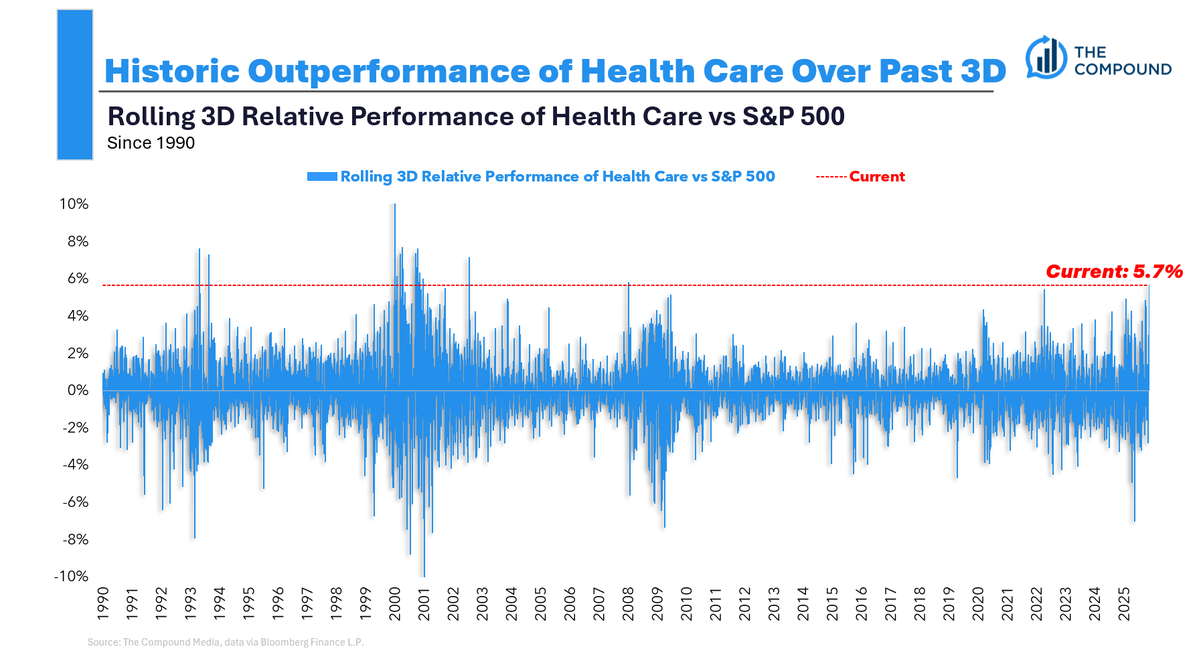 - As Matt points out, Health Care has outperformed by more than +5% over the past three days, marking its strongest three-day relative performance since 2022 and before that, 2009.