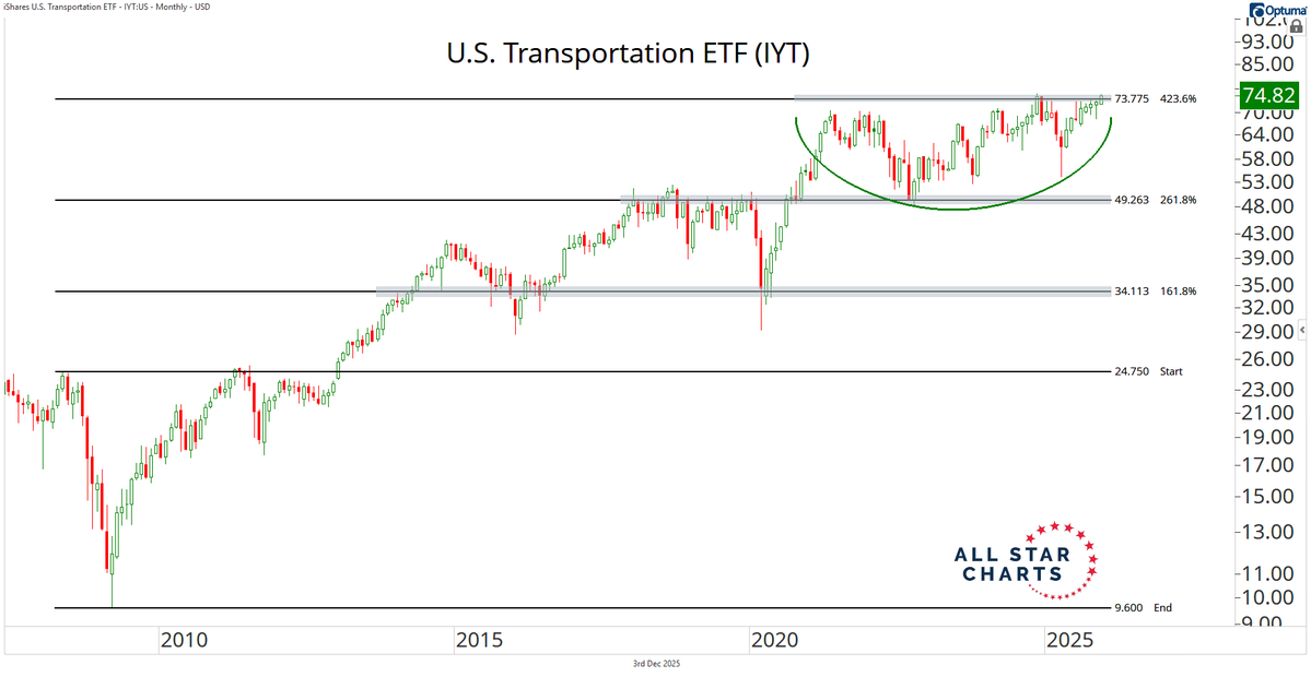 - Transports have been largely absent from the current bull market, but this vital group is quietly completing a four-year base. Transports could even see sustainable leadership next year if $IYT/$SPY reclaims its 2004 lows.